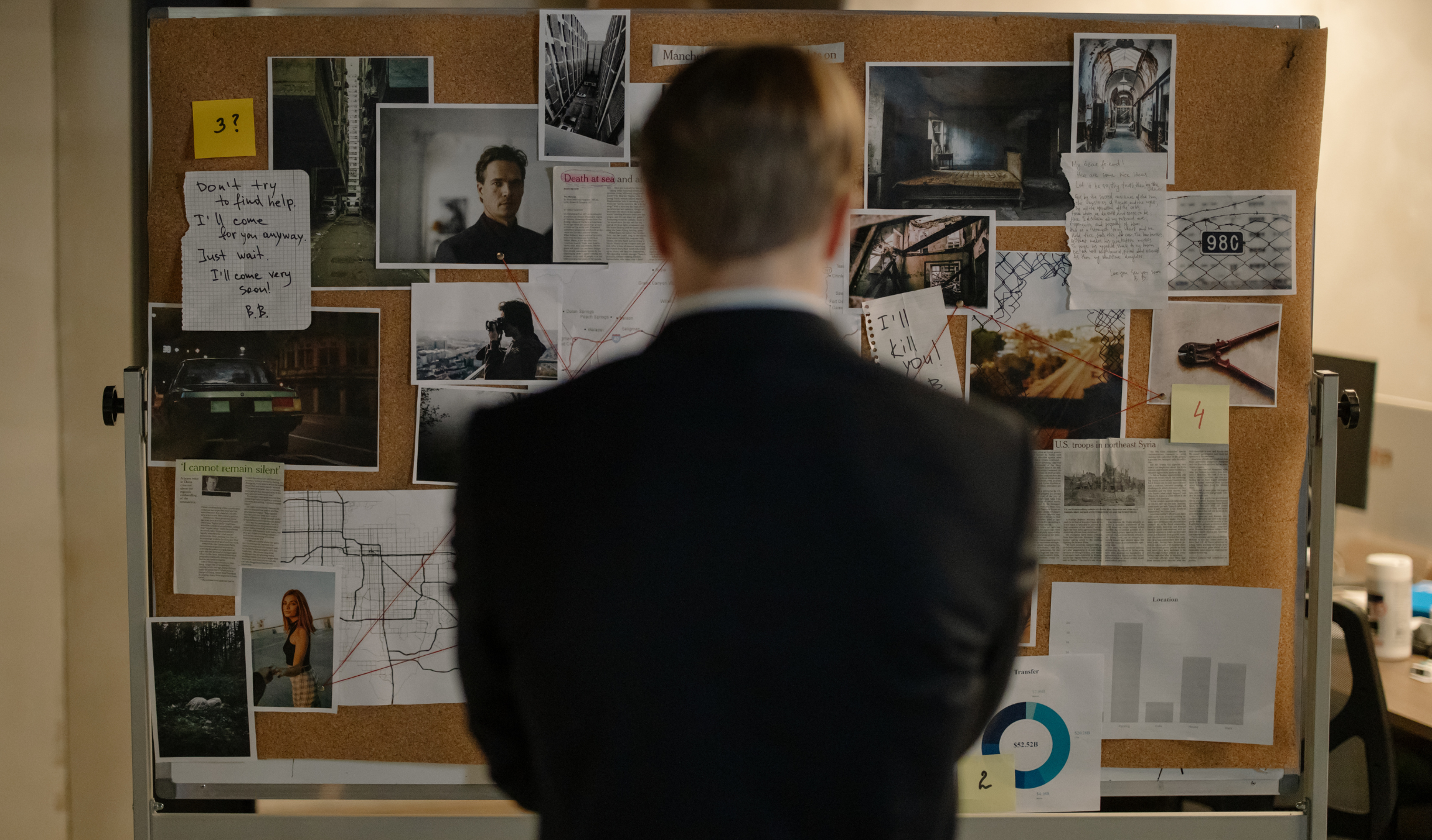 Person looking at a corkboard with photos, notes, and maps pinned on it, possibly for investigative purposes.